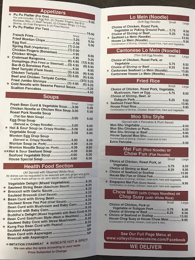 It really grinds my gears that this place has a low rating. Who gives 1 star reviews unless a place is miserable? This is a classic Chinese food place. Dont expect michelin star cuisine, expect cheap delicious chinese food! Nice people, great rangoons, what more do you want? For the people who rated 1 star without even giving it a second thought, reconsider your value system. PS Ive been eating chinese at Valley for over 10 years since college. Never had a bad experience. Not once.