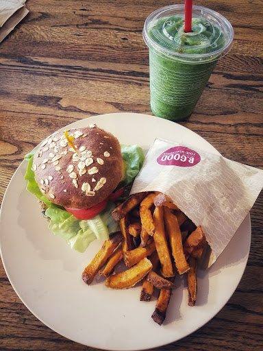 We love b. goods veggie burgers! They are really tasty vegan patties with yummy toppings. I love the West Side. Fries are great when theyve cooked them long enough. I only wish they offered vegan mayo and more vegan bowls.