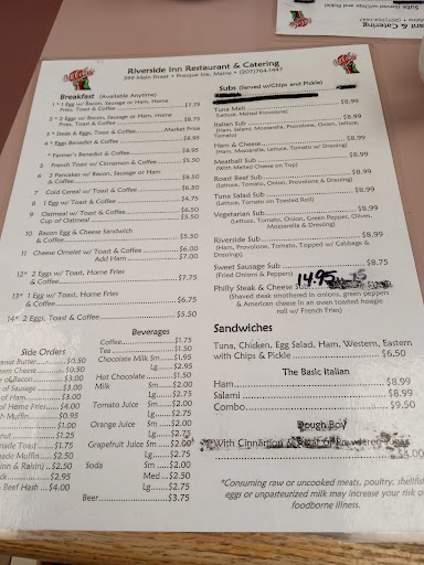 Good food at good prices. I have fond memories of the bakery that was in this location when I was a kid. This year was the first time Ive taken the opportunity to eat at this diner. I was very happy with the quality and price of the food and the attentiveness of the staff. In a city with a dwindling number of dining-out options, the Riverside Inn fills a much needed gap in a fine manner.
