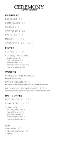 First impression: the atmosphere is warm and welcoming with ample space. They did the best they could to optimize seating with the small footprint. Customer Service: I go here often and am always greeted with a smile and someone who is knowledgable on the Ceremony product. Product: I have had everything from the standard drip coffee to the artisanal pour-over to the signature drinks. Theyre unmatched in Annapolis. You wont find a better cup anywhere.