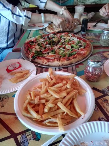 The atmosphere was very casual and is very small business like. They let you custom order each slice of pizza, anything you want custom made for you. If you want mushrooms and salami, order it. As other places make the who pizzas 1/2 something and 1/2 another topping. The pizza slices were very large, although you can order a smaller pizza the slices are pretty large. You can see the burning brick oven right behind the cashier with the wood, fire and the whole 9 yards! It was a amazing places. For all of these reasons I give BOP a 5/5 - Your reviewer, Talon