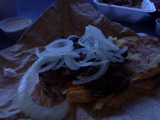 Yes they are located near a strip club, but honestly if you are in the area for Golds and stumble upon Chaps you probably dont deserve Chaps because your choice in strip clubs is questionable. Im not even sure Baltimores strip clubs match up to Atlantas, but thats beside the point. Pit Beef is not BBQ because its not smoked. Grilled hot and fast, crusted and rare, but still juicy. Its small with the actual grill taking up quite a bit of their space its always got a line out the door and around the way. Most people eat on their feet due to limited seating, in fact there is almost no seating and most people eat it to go. For those of you who are still using charcoal, you may not ever understand this place. If I dont have time to make real BBQ I use lump wood over charcoal because for the simple reason its, cleaner, easier to control heat, hotter heat and it still imparts some smoke flavoring. Something I noticed was how many gravy offerings they had. Platters, a la cart, etc. Gravy on sandwiches and fries is much more popular than back in SoCal. My first time here I went with the Beef Sandwich and Louie and a side of gravy fries and mac & cheese. The beef sandwich is more like a crusty roast beef/primerib outter cut. Its juicy, tender, thin, classic flavorings too. Piled on a bun that can hold up to it. Its really good, though I havent been around Baltimore enough to say its the best. The Louie was good too, thousand island was fresh, sauerkraut good and the bread really completed it. It wasnt the best, but then again the diff between this and a Reuben was the American vs. swiss cheese. Fries and gravy, bomb, not quite double fried, but crispy. Gravy is a hair on the thin side, right amount of salt. Mac & cheese I thought was a little suspect. Not quite enough cheese, thought it wasnt home-style either. Next trip I had the beef, ham and turkey combo. The ham stole the show on this, though I thought it should have been turkey, beef and ham on the bottom. The flavors pop more that way. Late I found out that was the habbit and better served on their sub form. I later got the big john which to me is worth the price, it feeds 2 easily and though Im from socal I have a cold weather people sort of appetite. The sides are large and should be shared, but the sandwiches, subs, not. The slaw is good, never soggy or watery or over mayo-y. Plenty of add ons if youd like. The ambiance is really a to go sort of place and its actually pretty easy to get in and out of here with its proximity to major travel roads. Napkins are generic and basic, dont do the job so grab a few. Tiger sauce goes good on everything, the horseradish isnt too strong and the creamier consistency of the mayo lets it seep into everything since the beef is cut so thin. Tip: Beef platter with cheese, slaw and tiger sauce is a must. There are a few items not on the menu, but mostly combos made up by regulars.