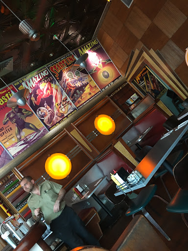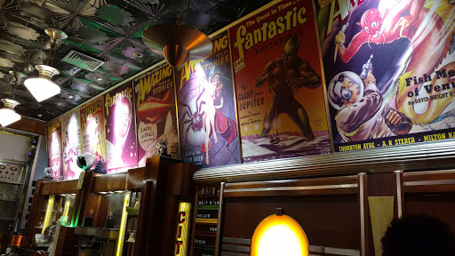 I wanted to like this place so much. The inside is amazing! Its all old pulp sci-fi decorations and I loved the vibe. The service was not good and the wait time was absurd. There was one other party when we arrived and two other parties when we left. Thats a total of three groups of people or probably 8-10 total people. My table ordered a cheeseburger, a hotdog with fries, and chili fries. It took them a full hour to get our order to us. Were they slaughtering the cow for the burger? What the heck? It would have been a little better if the server had been attentive but even with 2 waiters for 3 tables I didnt get offered a refill of my drink once throughout the wait or the meal and neither did the others at my table. To top it all off, the food wasnt good. I would go back if everything but the decoration was changed. I wanted to like this place so much and the only reason I am giving it 2 starts not 1 is because of the interior.
