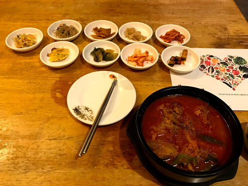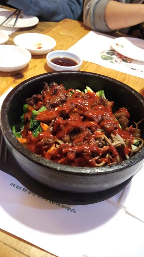 Excellent bibimbap, and a huge assortment of delicious banchan. Very unassuming space, but good food and reasonable prices.