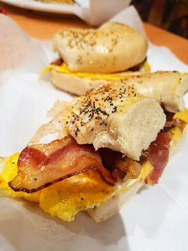 Got a bacon, egg, and cheese breakfast sandwich, really tasty. Bacon was crispy, bagel was top-notch. Egg was fried, none of that patty from a drawer stuff.