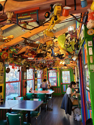 4 out of 6 dinners were fine We got lemon merengue milkshakes which were outstanding. Also a peanut butter / chocolate / banana and a kaptain krunch. All were good but fairly contraindicated with food. Next time I will order it for dessert. We got a veggie sandwich (soggy but decent enough) monte cristo egg, special which was corn cakes and eggs, and the fries / gravy / BBQ thing. Those were all OK and enjoyed by the people who ordered them. I got the chipped beef on toast. So terribly wrong. It had very odd flavors (chili? Rosemary? Something with a back of the throat bite and something fairly floral.) It was thich and gooey, not like a gravy or bechmel sauce at all. The toast was thick and only lightly toasted so the whole thing was like a disaster of soggy starch covered with school paste( which is, after all, flour and water). I sent it back and got an omelet. They got this out to me in minutes so I did eat with the rest of the tbale. No argument or anythig- they clearly wanted me to be happy. I really appreciated that since I really hate sending anythig back- it feels like I am making a scene. The eggs were cooked to rubber and sort of wrapped around brown avacado, crumbled to dust but overcooked bacon, and a decent amount of good cheese. It was not what I would have called an omelette and certainly nothing I would have served anyone at home. The people sitting around me had the monte cristo thing with egg. The things reeked with cinnamon so that I couldnt eat my food without having such a stong scent of cinnamon that it colored the flavor of my food. Not good. They ate the stuff and seemed happy with it. I would not have wanted to eat it with that much cinnamon. One the pieces of bread was absolutely black with loose cinnamon sugar. The fries were really good. The corn cake and egg special got rave reviews. The service was friendly and prompt. I imagine that the average IQ of the staff was 120. They were quick and friendly to deal with my unhappiness at the chipped beef. I didnt tell them about my experience with the omelette because in seeing others come out, it is the way they make it- a cake of whisked eggs on top of the omelette "filling". This is the way they make it. That is fine and they seem popular; its just not for me. Many reviews complain of the decor. I can undertand why some people might be put off by it. Very busy, lopped off doll parts, upside down things on the ceiling, but I thought it was funky and fun. I thought it was clean. I thought a lot of thought and effort had gone into the decor. The outside plantings were inventive and the pez dispenser display has to been seen! All in all I would say that the problems were user error. I know better how to order next time and I hope to go back.