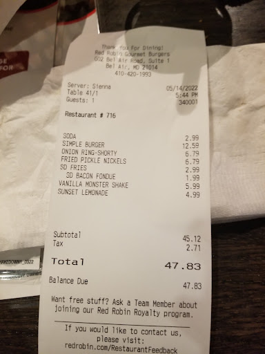 We have loved Red Robbin for years and have eaten at locations in multiple states. Our first experience with the Bel Air location in early 2011 was very good however after 4 follow-up trips over the following year we have vowed to never return. On each of the following trips the service was generally poor, we would wait nearly 1 hour for our food to come out (even though it wasnt very busy). The food itself was lacking a bit in presentation and was far from properly cooked. When you are a burger joint, you should be able to turn out a burger that is cooked to specification. I have had medium burgers come out well-done and on the last visit my daughters well-done burger came out rare. Never again Red Robin, Never again...