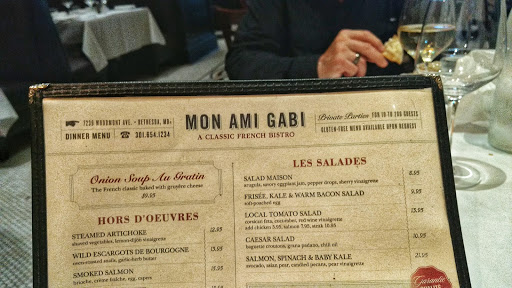 Mon Ami Gabi is a wonderful French restaurant that I love to go to on occasion. The location is wonderful with plenty of parking nearby as well as a librarian and pottery studio. The restaurant itself is beautiful and the food is absolutely delightful. Every meal is served with a crispy baguette and butter as well as water with ice, of course. I personally recommend the escargot or snails in pesto which are an adventure as well as a delecacy. I also love the croque monsuer which is basically to a ham and cheese panini. This restaurant does accept reservations but is also open to people dropping in. It is very classy and I have seen many birthday parties for adults hosted here. Mon Ami GabI is a wonderful restaurant for those exploring the Bethesda area for lunch or for dinner.