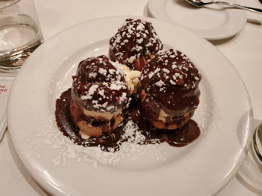 An alumni dinner at Mon Ami Gabi was a nice consolation in making me momentarily forget and feel better about how much I owe in dental school debt. We were treated to a four course dinner where we were given a prefix menu with 3-4 selections for each course (except for salad course). My classmate and I decided to split each course to sample as many items as possible. We opted for warm Brie and scallop gratinees for appetizers, chicken pillard and mustard salmon for entrees, and profritoles and chocolate mousse for desserts. They started us off with warm, toasty house made French baguette with soften better. Carbs and I are inseparable - I especially appreciated that they spent the time and effort in heating them up! These baguettes were the perfect munch as they worked up our appetites on what were to come! Scallop gratinees - they turned out to be too good to share. I polished my plate clean before acknowledging "oh ya we were supposed to split". The cheesy, bubbly cream over the sweet, caramelized onion baked over meaty, whole scallop. Wished there were more than 3! Mustard salmon - moist, flavorful, made to perfection. Paired with citrus sauce over the buttery, creamy mashed potato - what a nice contrast! Chicken pillard - the chicken was a bit dry for my taste. However the baked kabocha squash and mushroom sides were beyond delicious! I would order this dish again just got the sides alone! Profitoles - puff pastries filled with giant scoops of vanilla ice cream and drenched in chocolate fudge sauce - what is there to not love? Pure scrumptious! Chocolate mousse - light, smooth, and airy - everything a chocolate mousse should be! Loved the extra crunch from the dark chocolate puffs and the additional creaminess from the whipped cream! Since I have a reputation of insatiable appetite, all leftovers were generously offered to me. I was able to sample the traditional steak and creme brûlée. Tbh Im not a big red meat eater - the steak was a bit tough and I didnt think it was all that special. However, the dollop of herb butter over the steak was a nice touch!. The creme brûlée on the other hand was out of the world! Rich, decadent, so so so good. Already had eaten 6 courses worth of food, my stomach managed to expand further and finished everything. Overall, what a treat! Service was beyond attentive even in a private, large group setting. Price can be a bit steep but well worth it! Happy belly = happy alumni. Hope my school hosts all future alumni events at Mon Ami a Gabi! I will be sure to clear my schedule to attend!