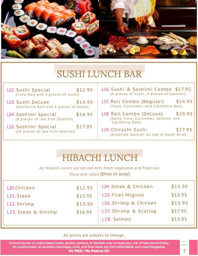 Wife and I go here at least once a month, $10 lunch is great too! Great staff, hibachi chefs are fun to interact with. Great place! Recommend to family and friends