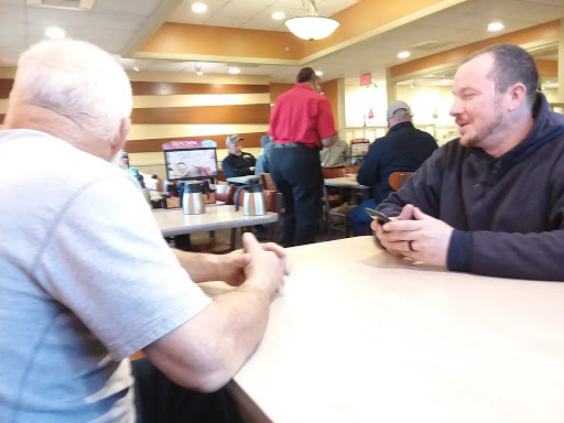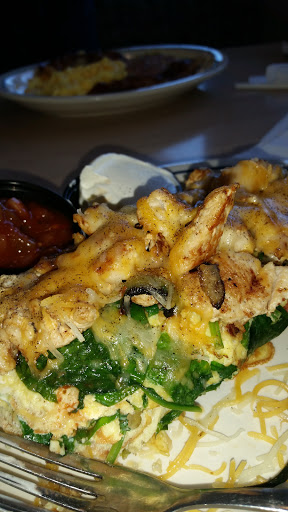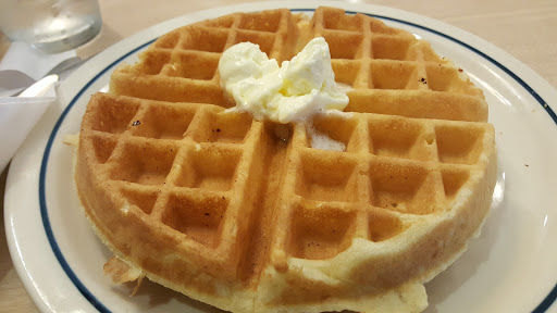 Friday 9am, parking lot full, we got a table right away, the booth seat had a huge tear in it. My friends ordered coffee, had to ask for sugar. There was something floating in one of the waters. My friend ordered blueberry waffles. At end of order waitress asked if we would like ketchup. I said yes. She delivered food. No waffles. She went back to kitchen and found out "the waffle maker is not waffling". She offered to substitute pancakes. They we delivered quickly but not blueberry. She did not bring ketchup, we asked for it and she brought hot sauce. I am amazed how many people were there and how bad the experience. Will not be back