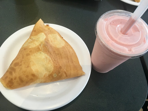 Crêpe was off the hook with tender shrimp and fresh veggies rolled into a perfectly cooked crêpe with spicy-tangy-sweet sauce drizzled on top. Blueberry smoothie was very good too. Clean unisex restroom. Seating area is small so you might have to wait.
