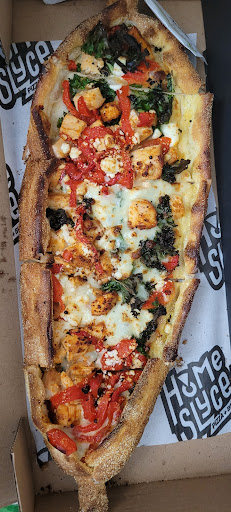 HomeSlyce is a pretty cool place! I came here on a Saturday night with friends and it had a decent crowd of people inside. The place had a really trendy, urban feel and its great for meet-ups and group meals. I ordered the "slyce" pizza which is essentially a pizza boat. It was REALLY good-- the ingredients tasted great with the whole bread bowl type-concept. Service was decent though I wish a bit more attentive. Overall, definitely worth going to! Both the Slyce Pizza and traditional pizza pie are really good! And they deliver!