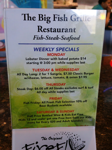 Ive been to Big Fish well over 20 times, always good food & service, sometimes better than other. However many changes in the menu and staff so I will now give them a 1, if there was a 0 thats what it would be. Today, A Very bad waitress, (which I looked over) but she brought me the bill, it was doubled the price. I said to her you said everything lunch time was 1/2 price. She said Oh I was talking about the wine only.....Needless I did not argue, I just paid the bill. After signing my tab, here comes a manager asking be about is there a problem, (mind you I did not ask for a manager), it was not worth it to me, and he began to antagonize me as a customer. I was at first fine, but proceeded to tell me what she did not say, (mind you he was not present) ....After calling me a liar, I asked him nicely to remove himself from my presence as I did not complain so there was no need for him to accost me.. It got worse... Needless to say He actually told me God Bless and Come Back again, REALLY........Management at its WORSE............