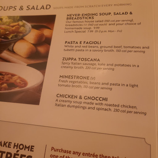 This was the worse olive garden Ive ever been to. My friend got me a gift card and we came here. The menu said soup salad and breads ticks and a entree. Well our waiter said one of the other. I never heard of that. And God forbid if u ask for more breadsticks. The soup was watered down. It was the worst experience I ever had at olive garden