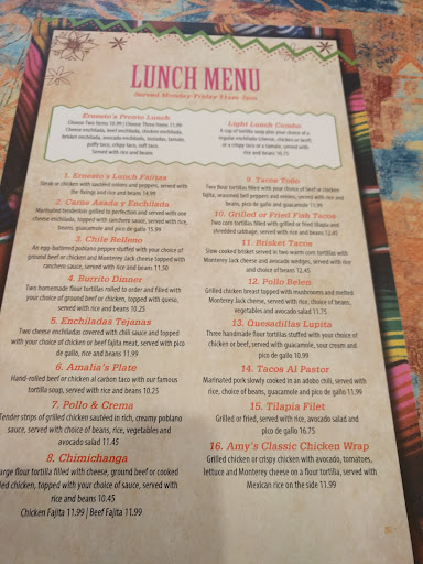 Walking in the door was a little disappointing. It seemed that the hostess was stretched a little thin for her time. Im thankful to say, that the food and service otherwise made up for a rough introduction. The restaurant itself is comfortable. There is a really nice patio outside if you find yourself there in good weather. The food was better than average. I offer no professional opinion on authenticity but flavor, spicy, seasoning was all great. My boyfriend and I both ordered tacos of different varieties and everything from the rice that came with them, to the corn tortillas they were on, to the toppings were just great. I was particularly fond of the carnitas tacos I had. We got a small order of queso to go with our chips and it was warm, flavorful and just hit the spot. I feel like the prices are a few bucks more then surrounding sit down Mexican restaurants but from the looks of the food coming to tables near us and the quality of what we ordered ourselves, I would be willing to pay a few dollars more here at Ernestos versus saving a few bucks at places nearby like Pachanga or Mi Casa. I can definitely see us coming back without much hesitation if we are in the area and craving Mexican food. One thing that caught our eye was the specials menu for each day of the week. I wish our server had mentioned it because I would have ordered the combination plate on Sunday.