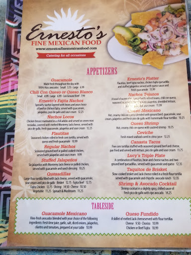 In my opinion, Ernestos has the best Mexican food in Howard County. The fajitas are our usual choice at the restaurant. Weve tried them all -- steak, chicken, shrimp, veggie and a combo. Everything is grilled beautifully. The food comes out to your table wonderfully fresh and with a great aroma. The vegetables are cooked just right; not over cooked or under cooked. There is one special dish that we have ordered a few times. It is flamed at table side and is a tower of shrimp, chicken and beef. Im not sure of what it is called but just ask the waiter about the flaming tower, and they will know what you are talking about. I recommend sharing it with a friend or plan on bringing leftovers home. Even the chips and salsa served when you are first seated are better than those at other Mexican restaurants. The prices are very reasonable especially given the quality and quantity of the food. Our usual choice, the combo fajitas (shrimp/chicken), are $16.99. You can also get them for two for about $28.00. Weve tried other dishes and were always happy with our choices, but the fajitas are the best selection in my opinion. Oh, did I forget to mention the margaritas. They are huge and very, very good. We brought a number of friends to the restaurant and everyone has loved it.