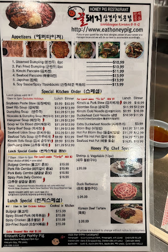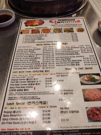 Note: This review is on food quality and service, and I expect reader to know what Korean food is all about. So if you have not familiar with Korean BBQ and you are looking for food description, you will not see lots of that in this review. Review and comparison to other Honey Pig: This honey pig location is good. If you are looking for a relax place to eat, talk loud, and drink alcohol, Honey Pig would be the place to be. The interior theme is like going street restaurant/food place. The music inside is fairly loud, and the vibe is "chill". Like I said, street vending is the theme. Ive been to the original Honey Pig in Annandale, VA, and the new one in Germantown, MD. This Honey Pig location have fresh food and good service. I do have to say that this location services have been going down ever since they opened the Germantown location. I understand the reason why this location quality is going down, and thats because they are pulling resources to their new location (thats my business analysis). So, when you are used to a certain quality and then it changes for the worse, you will want to question management on what they are thinking. In all, I am satisfied with this locations food and service compared to the Germantown one. Ive not been back to the Annadale one in more than 5 years (so dont ask). Lots of things could change over that time span. Germantown location gives you less (meat) with the same pricing, and they are slow on their service. The Germantown locaiton have waiter/waitress standing around but they will not come over to see how you are doing or fill up on your drinks. One of the biggest things about having good service at a restaurant is being prompt with drinks refill. In conclusion, I recommend going to Ellicott City location compared to Germantown location. Food is fresh and good, and the service is better than the other locations. FYI: if you are expecting great service like Ruth Chris, Mortons, or somewhere fancy, be ready to be disappointed. Honey pig service is closely comparable to going to a Chinese restaurant and their pricing is on the upper end of the scale. Update (01/2017): Their Ellicott City location service have not been as good as it used to be. Its actually gotten worse. I also want to make a note that I ate something that tasted like a COCKROACH in my salad. It is those little salad bowl they initially give you when you first order food. I firmly believe that is was a roach, but when i spit the salad out, everything was a crewed, and I did not want to dig through to confirm it. I was already sick to my stomach and at that moment I was so grossed out that I didnt want to confirm it. I lost my appetite for everything that came after.