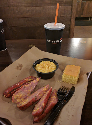 Mission BBQ always has good BBQ. Excellent spare ribs and pulled chicken! My husbands favorite is the smoked yard bird. Its funny how the staff always explains to customers that order the yard bird that the "pink" ring is from smoking the chicken. True bbqers know abt smoke rings and YES the meat is done! The sides are delicious as well. Mission had a good thing going. Keep up the good work!!
