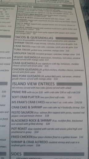Stumbled upon The Island View and couldnt have been happier! We were lucky enough to have walked in on Crab night! They were beautiful crabs, caught straight from the Chesapeake Bay that morning. The deal is $1 or $2 crabs or large by the dozen. Delicious! We also ordered from Island Views menu. We tried the Crab Cake and were not disappointed. These crab cakes were featured on MPT and we know why. Yummy! We also tried a cup of each crab soup, Maryland Crab and Cream of Crab. And the Crab Pretzel is like nothing Ive ever tried before, no cream cheese, just crab and seasoning. Beers were cold, servers were fantastic. We even met the owners! What a nice family! They gave us the history of the building and their story and it just added to the charm. We will be back!! ps. this is not a corporate restaurant. They are a family business in operation for 42 years! wow! Sit back and relax there! Enjoy the view and appreciate a restaurant that really does want to make you happy and have you come back again and again!