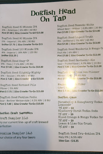 We love Dogfish in this family. Its our go-to restaurant. Weve had just about everything on the menu at this point and its all good. Our favorites are the mac and cheese, the canary pizza, the steak bomb sandwich, the border burger and the calamari. Oh and of course the beers. I prefer less hoppy beers, so especially come winter the selection does get a bit limited for me, but my husband loves those. The Black and Blue, Festina Peche, Sah Tea, Pangea and Punkin are my favorites. My husband usually gets either a 60 or 90 minute IPA. Weve never had a bad server. The place can get crazy busy but if youre a normal sized party (less than 6) they can usually get you seated in a reasonable time frame and you can also call ahead to see how busy they are and if needed add your name to the list. There are coupons regularly in the Valu-pack mailer so dont just throw those envelopes away.
