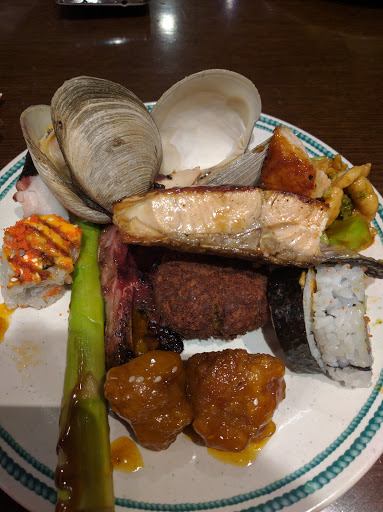 This is a pretty solid Asian buffet with a wide variety of dishes. The majority of the food is okay, some are pretty good. I think the desserts are average, but the ice cream they have are below average. They are all of that non fat stuff--no richness, just sweet. I wish they had a soft serve machine. That would make all the difference in the world! What I like to do is start off with a plate of sushi. You can pretty much make back what you paid for the meal just on sushi. The sushi is decent, nothing outstanding, but for all you can eat, its pretty good. Ive never had a problem with the sushi here. Then I like to load up on seafood. As others have mentioned, the seafood is the best choice here. You have fish, shrimp, clams, snails, crab--you can really go to town on that. The other meat selections are also decent (such as the Korean beef short ribs). The duck and roast beef is hit or miss, when its good, its pretty good, but sometimes it can be over done and dried out. They dont have a huge variety of fresh vegetables (not including the salad bar). I wish they would have Chinese greens like yu choy or bok choi. Lately, its been spinach and green beans. Overall, a good deal. Usually when I go here, I dont have to eat for the rest of the day!