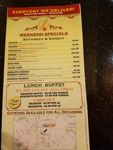 Best food in germantown. My favorite butter chicken, brain Masala and chicken chargha. Must visit and they also have lunch buffet 7 days a week for $7.99. :)