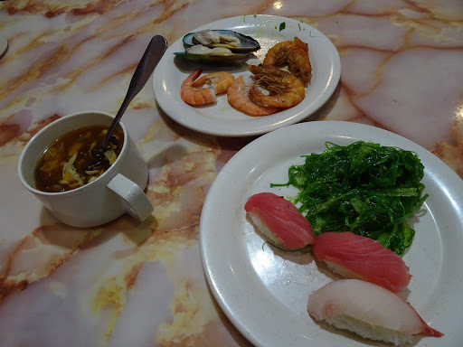 I went here for my 17th birthday, It wasnt as terrible as I expected. The staff was quick to refill our drinks and take away our dirty plates but they were also quite rude. We stayed for about an hour and a half and you could see our waiter glaring at us like she wanted us out. Also, most of the food I ate was great- but their was also some huge disappointments. The mac and cheese, it looked so good but it tasted like sad, wet noodles. Couldnt even taste the cheese. Another thing- the shrimp. I LOVE shrimp, and I wasnt expecting it to be perfect but out of the 8 I had, I could only eat half. The other half were either still frozen or had a yellow tint. Also, the sushi, I probably had 2 full roles- every now and then I would eat one that tasted like pine sol. Lastly, the establishment was suprisingly clean, first buffet where my feet didnt stick to the ground- but that all changed when I went to the bathroom. I could barely pick my shoes off the ground. All and all, I would definitely go back. Its cheep, decent food, and pretty clean as long as you dont use the bathoom.