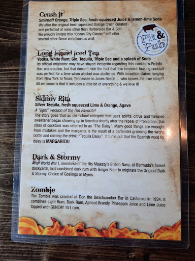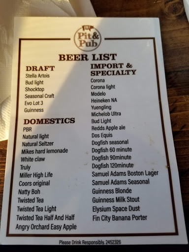 Not a pit; not a Pub. Other than that its name is accurate. BBQ was tasteless, and the sauce had no inspiration or particular flavor. The ribs were stale and tough with the same uninspired gunk dabbled atop. As for the pub part, well, if all that is needed is Bud and associated drivel on tap, then I guess someone would call it a "Pub." Any stricter use of the term, and this place wouldnt make it. Beers were all generic and low class. They had a handful of mixed drinks that they called their "signatures." Nude on the beach really tasted like cherry mountain dew with a teaspoon of tipple. Really poor quality stuff. The saddest part of this place is tbe staff seem to care. With some inspiration in the kitchen and a little experimentation open mindedness in the bar, thus establishment may just be able to live up to its name someday.