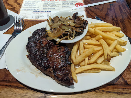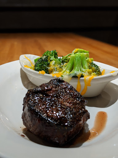The food here was really good. I had family in town visiting and we went there twice in one week. The first time, we were seated right before 530pm and they still gave us the option of ordering from the early bird menu. I got the pork chop with wild rice and broccoli with a cesar salad. Everything was delicious. The pork chop was juicy and flavorful, not overdone, the rice was awesome, broccoli was steamed perfectly and the salad was crisp, and finished it off with a seasonal Sam Adams Summer Ale that hit the spot. I never had to be asked if I wanted more water, which I appreciate. My wife ordered a fillet; on the rare side of medium-rare and it arrived overdone. They took it back and brought her another one, and it too was a little overdone, but she took it anyways and it was fine. The second time we went there it was busier and we had to wait a few minutes. There was a couple that thought they would be slick and snuck past everyone waiting. Someone mentioned it to the manager and he asked them to go out and wait like everyone else. This time I ordered the medium-rare prime rib that had amazing flavor and juicy, again with wild rice and broccoli. I like wild rice and it was that good. My dad said his broccoli was really undercooked, but mine was the right amount of soft without being too soft and crisp without being too crisp. And the Sam Adams Summer Ale went down just as smooth as before. Great service and you can tell they are trying to make sure everyone has a great dining experience. Great service and a manager who cares.