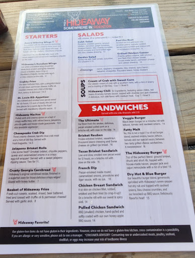 DISCLAIMER: This review has more to do with the restaurant management than the grub. I wish I couldve had the chance to try it out. I was traveling through the area en route to Philadelphia for business and a local friend of my mine suggested we check it. Out. I was pretty excited at their menu choices. I didnt arrive until almost 10 p.m. but the restaurant website said they were open until 2 a.m. Were seated but have to wait several minutes for a server to give us menus, which turn out to be these tiny, pathetic latenight menus with generic hot dogs, burgers or wings. There was no brisket, pull pork, ribs or any of the basics to be considered a BBQ joint. I can understand swtiching over to a simplified menu during later hours but even the good look appetizers like spicy fried mac n cheese balls werent doable. Our server said the restaurant removed the main menu at 10 p.m. She was completely unwilling to even ask the managers if an exeception could be made since it was 10:02 p.m. Since she refused, we left, and the sever actually sighed, sulked and slumped as she walked away. What is this, kindergarten? In anycase, I was very frustrated considering the long drive I made and the fact that the website said they were open until 2 a.m. but mentioned nothing about a bland (lazy) late night menu. I wouldnt have minded as much if they at least had SOME BBQ or some of the more creative apps. If I knew about the lousy late menu in advance, this whole thing could have been avoided. Better yet, if youre a restaurant open till 2 a.m. then why start the late night menu at 10 p.m.? Why not start it at midnight? I called the manager to (politely) explain the situation and point out the inconsistencies between whats advertised and what I actually experienced. However, she showed a complete lack of interest, thus prompting me to write my first Yelp review. I hate to be the negative nancy in light of all the great reviews this place has, but figured Id alert any fellow late night travelers who are craving BBQ while driving through Maryland and thinking of stopping at Hideway.