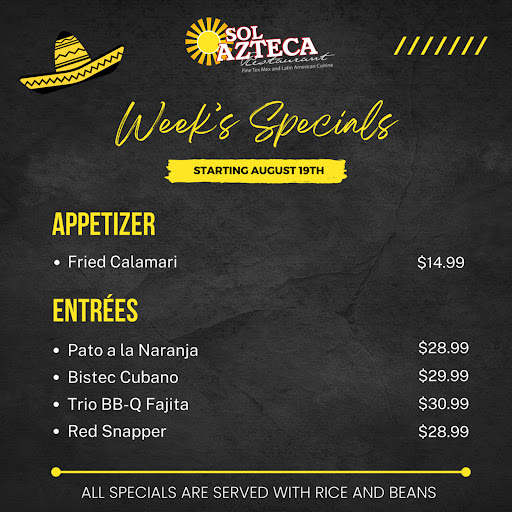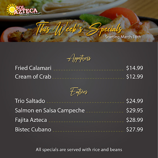 Every single time I dine at Sol Azteca, the service is excellent. food is excellent and the prices are reasonable. I have never had a dish that wasnt superbly prepared, served at the right temperature, etc. These folks really got this down to a science. I have been going there since they opened and I sure hope they stay around for a long, long time.I would also