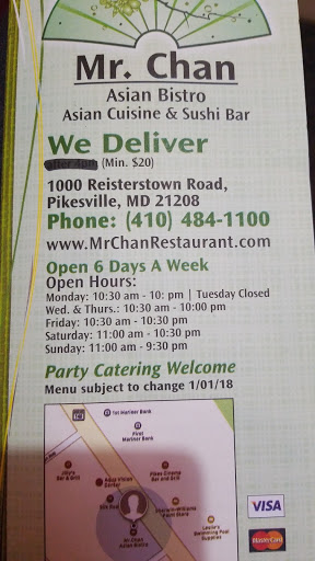I love Mr. Chans - its one of the few places where you can get brown rice with your meal, & the only place I know of in Baltimore that serves Yuba. Ive been there for both lunch & dinner, and have also ordered carryout. While they have traditional Chinese dishes, they also have more unusual meals and a wide variety of vegetarian dishes, along with great sushi. Ive never had a bad meal there - highly recommend it!
