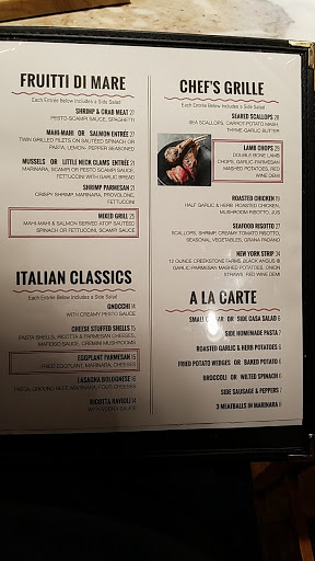 We had dinner there tonight with friends. We arent the type of people that complain when we are out with people had we been alone we really would have been vocal about the quality of the food. The Italian salad had a sweet dressing and not in a good way. The pasta was so thick that with a tiny showing of peas (maybe 5) and not much more prosciutto it came across as an mushy mess. My husbands shrimp had batter/crumbs so thick that you took a few bites before actually finding the shrimp. Those had that soapy ammonia thing going on. No bread was served. Well, maybe it was on the outside of the shrimp. The restaurant had beautiful lighting and the wait staff was trying very hard. I was a bit surprised when the server didnt ask about my husbands dish when he removed the full plate. Well he did ask if we wanted a box. We didnt.