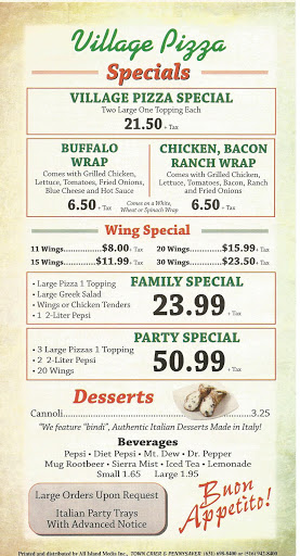 The food is really great and the service is amazing. I love village pizza its a great place to get food!