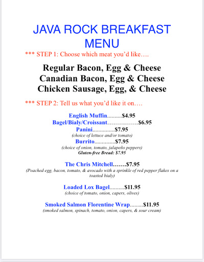 We love Java Rock for coffee and quick breakfast. People there are nice and pleasant.