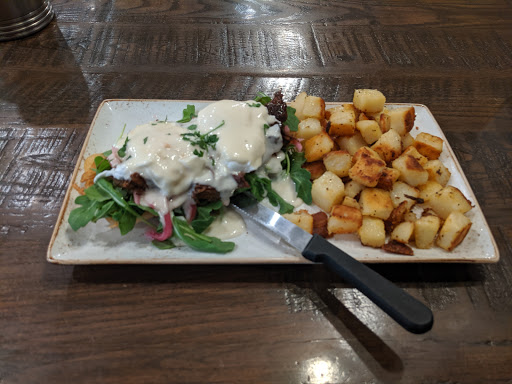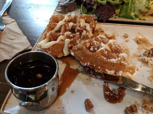 Wow, so very much beyond my expectations. The carrot cake pancake with added chocolate chips required no syrup at all and it was 8" across! The eggs were cooked perfectly and the bacon was crispy but not burnt. DH had the Chickichanga because of a recommendation here and loved it - maybe a touch fewer peppers and a bit of egg in the center would have held it together better but the taste was excellent. When we got our check we realized this place is a small chain with one close to our house...well definitely be checking that out.