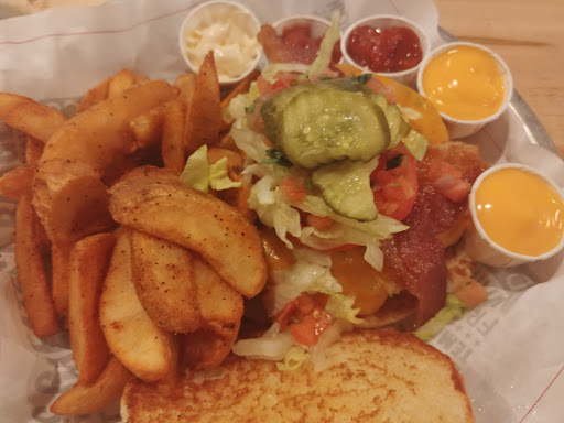 A well-run Fuddruckers in South Rockville. Food is pretty fresh, as seen by the free Topping bar. Topping such as tomatoes, lettuce, onions, pickles and others are very good quality freshness & regularly refreshed when quantities are low. Standard Fuddruckers menu is available. Mix of burgers, hot dogs and salads along with some specialty items (for example, game meat burgers such as Elk or Bison are often seen on the menu). I personally find the staff friendly on average. Plenty of groups come here, especially families and other large group organizations. Overall, a consistent experience at this establishment.