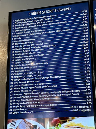 The Belgian chocolate crepe was delicious and ENORMOUS. Most crepe places skimp a bit on the filling, but this is the one time when there may have been too much, not to mention the generous amount of powdered sugar and syrup on top. My savory eggplant crepe was not particularly spectacular, though. Ill definitely come back and sample some of the other menu items. The nutella crepes and lemon sugar crepes sound particularly appealing.