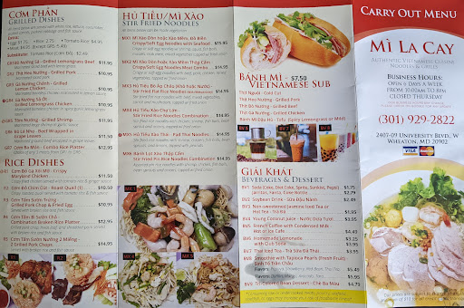 Mi La Cay is one of my favorite Vietnamese restaurants in the area. The food is delicious and you always leave satisfied! They have so many different types of noodle and rice dishes. Their menu is pretty huge so I have yet to try everything. So far, Ive had the normal beef pho, Pho La Cay (P10, which is my favorite so far. It is a spicy beef noodle soup), and Mi Bo Sate (M10). The broth for the noodle soups are always aromatic and flavorful. These big bowls of noodle are great for the cold weather! As for the rice dishes, Ive only had the fan favorite, Crispy Maryland Chicken (R1). Its Viet style fried chicken over tomato flavored rice. The chicken had a nice crispy skin and the meat was juicy and tender. It went well with the tomato rice. My friend always enjoys the two pork chop over rice. They also have banh mi! They serve bubble tea and smoothies. I always get the avocado smoothie. Its creamy and delightful. The restaurant is a normal sized restaurant and is pretty popular. Ive never had any issues getting a table. I cant wait to return! *Plenty of parking and they take credit card.