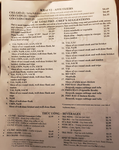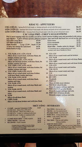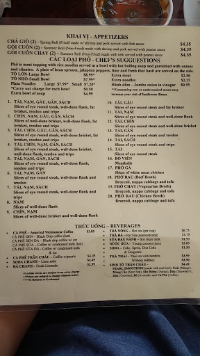 They only serve pho, a couple appetizers, and drinks (coffee, coke, smoothies). Their pho is piping hot, and pho-king good. Portions are generous for the price.