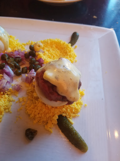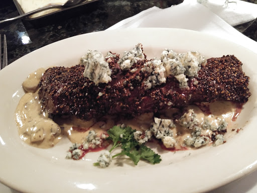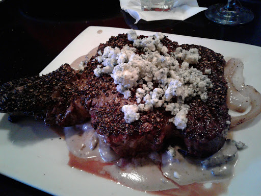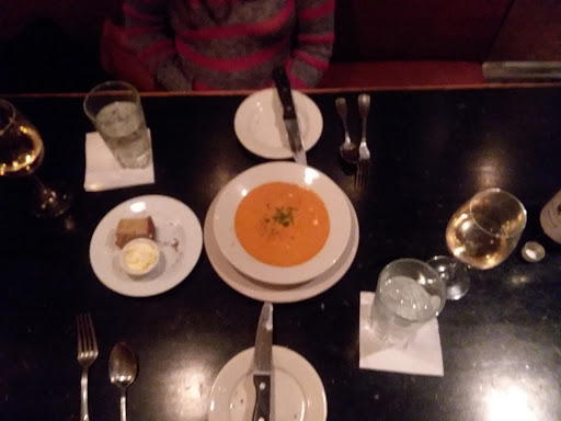 We ate in the lounge--a more casual area in the bar. The service was friendly and attentive, and the food was delicious. My husband had a really fantastic NY strip steak, and I had crab bisque and scallops. Everything was top notch, but very traditional. No food surprises or exotic flavors here--not a judgment either way, just explaining the kind of food to expect. The crab bisque was filled with huge lumps of tender, sweet crab meat. The scallops were perfectly done and perfectly fresh. I also liked the creamed spinach and mashed potatoes that came as sides, but the amount of butter and cream in the meal ended up being a bit overwhelming. Some lighter sides would help freshen things up and balance the meal better. We also enjoyed the rosemary bread and spiced cashews served alongside the meal. We were both really pleased with our wines by the glass, too. Its not an extensive list, but it is clearly carefully chosen. I had a well-balanced sauvignon blanc, and my husband had an interesting, but not excessively assertive shiraz. Dessert, which I cant believe my husband could squeeze in, was a very nice key lime pie--including the mellow yellow color real key lime actually is, without the disgusting vivid green this Florida girl seems to encounter everywhere she tries to get her old favorite! For 2 glasses of wine, 2 entrees, one appetizer, and one dessert, we paid around $70, which we found very reasonable for the quality and quantity of food. Well be back, Ray!