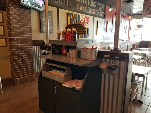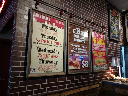 Loud, not very clean. Stale peanuts. Cornbread was too moist and tasteless. Meats werent bad but very greasy. Pork and beef were tender but both meals had pretty large fatty chunks. Dont bother with the Virginia honey draft root beer if you like typical root beers. French fries were whole cut potatoes and not overly salted or greasy, guess they saved the grease for the meat. Cost $22 for 2 meats, 2 sides, 2 breads and 2 drinks. That seemed a little steep for fast food.