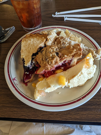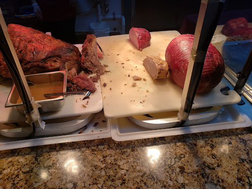 Listen, this is not gourmet dining, in any way, shape or form. This is most definitely a quantity over quality establishment. Once you realize that, and set your expectations it isnt terrible. If you are a food snob, go elsewhere. It is almost like time traveling back to the 60s or 70s with the way that the waitresses dress. Showing skin is forbidden if you are a female and you work here, really weird. Regardless, the service was pretty good for a buffet. Quick to be seated, quick to be greeted, and quick with the refills and the check. The food was decent, think of it as American comfort food. Fried chicken was fresh, crispy and tasty. The roast beef was pretty good, but the carved ham was just a basic, pre-formed ham roast. Mashed potatoes tasted like they were made from scratch, and the candied yams were great. They had corn fritters that could have been a dessert on their own, really tasty! The dessert selection of pies is incredible though, thats worth a star all on its own. One thing that really annoyed me is that only 1/4 of the items on the buffet were labeled and they were ALL things which you knew what they were. I dont want to have to guess what I am putting on my plate...