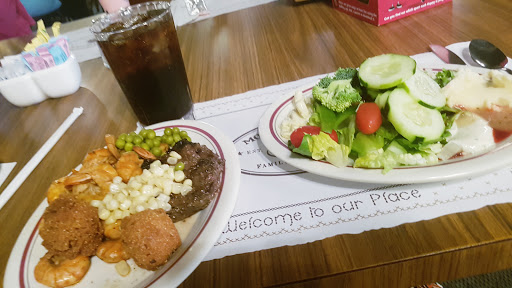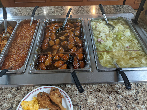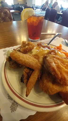 Imagine the cafeteria of a cut rate nursing home. Now imagine that, for $11.99, you can eat all you want of whatever is on the menu. Thats this place. Crumbs and dirt covered the lumpy, threadbare carpet. The food itself tasted like canned, over cooked, mush. The fried chicken wasnt bad, but they only put out thighs and wings the entire time I was there. I felt like the service was slow, but the staff is mostly nearly dead or not all there so I guess that comes with the territory. Ill also mention three or four letters of their sign were broken out and a heavy wood lighting fixture in the dining room was held to the ceiling with zip ties. I wont eat there again.
