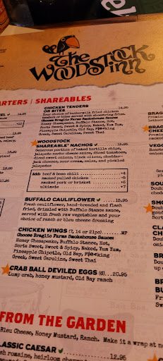 Great spot for casual dining and drinks. Im a big fan of the chicken fingers (they make em there), the open-faced sandwich and the smokehouse burger. Theres always a seafood special or two on the weekends. This place has character. Dont expect a chain-restaurant vibe...this is a place to see bikers and horse-back riders stopping by after a ride around the beautiful surrounding scenery and trails. Its also a spot where locals gather to play pool and folks come from all around to hear local bands put on intimate accoustic shows. Thursday nights Spike (lead singer from the well-know area band Never, Never) does a show at 8pm that is not to be missed. Also popular are the new Friday night country music live shows at 9pm and they have different established rock and blues bands playing at 9pm on Saturday nights. The staff is terrific and the food is all made-to-order. Theres a moderate selection of wines and liquors at The Woodstock Inn which is a step above other area watering holes. The atmosphere is warm and comfortable. I recommend it.