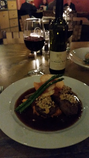A gift certificate was burning a hole in my pocket. My husband and I went and loved it! I started with the garlic baked muscles. Garlic butter and feta? YES PLEASE! They were beautiful and thought the feta was great for a touch of saltiness. I got seafood crusted salmon. Oh. My. Goodness. My perfectly pink salmon was topped with crab and lobster. It doesn’t get any better than that. It was served with an asparagus risotto and a pesto drizzle. This was one of the best meals I’ve ever had. It was hot and flavorful. Such a great combination of flavors that didn’t overpower one another. My husband had a 14oz sirloin steak with a butter and raspberry beer sauce over mashed potatoes. We had no room for dessert and will look forward to returning! Parking was easy.