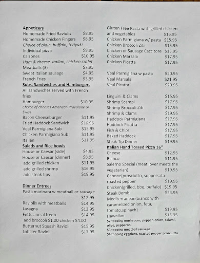 Driving through town and we were looking for a local place to eat and decided to give Salernos a try and we were not disappointed. We had the steak tips, ravioli and the ravioli of the month which was lobster ravioli and everything was excellent. Their ravioli are made locally and they are very filling. The steak tips were excellent and the lobster ravioli was made in a cream sauce and they were perfect. The service was great and you get a lot of food for your money. It looks to be a local favorite so if you are passing thru I recommend stopping here for dinner.