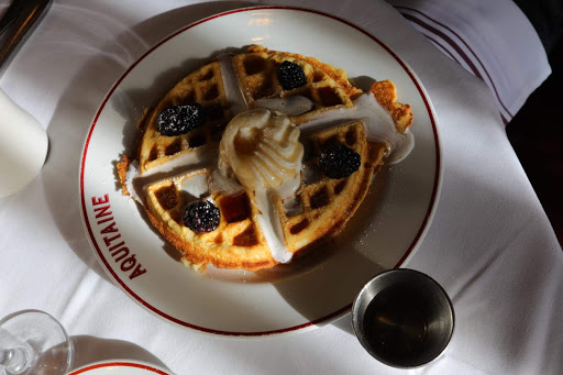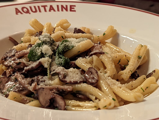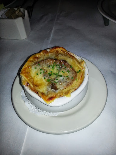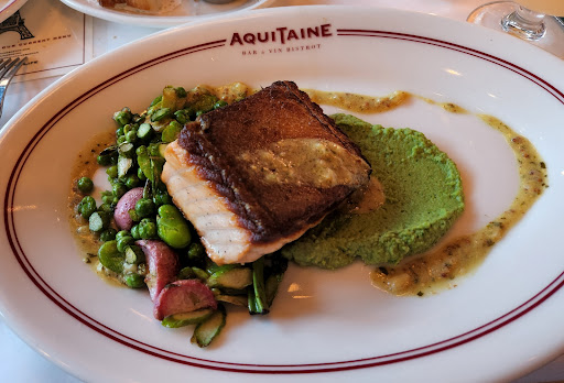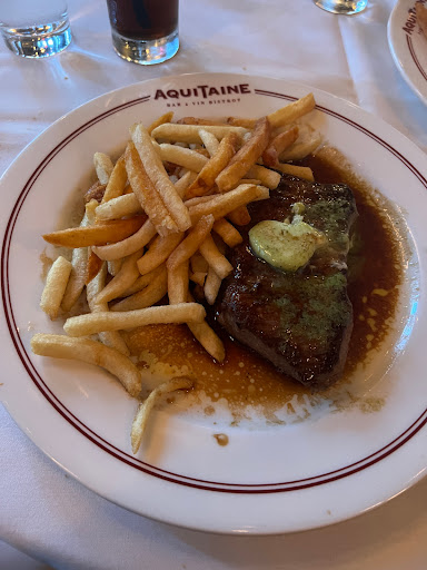 French Restaurant, or Italian restaurant wanna-be? First a disclaimer: I used to live and work in France. I know a french restaurant when I see one. Aquataine, frankly, is not one. (I should have known by the "chicken salade" on the menu.) I had lunch there yesterday with two colleagues. Between us, we had Croque Monsieurs, French Onion Soup, Tomato Soup and Salad, and Steak Frites. The tables had a bottle of San Pellegrino - an Italian sparkling water, so I could tell we might be in for trouble. The staff didnt speak any french and werent familiar with Poutine, that national food of Canada, that my colleague asked for. The lunch menu offers a special having soup, sandwich, and soda/coffee for $12.95. It doesnt mention that its only half a sandwich. When I asked the staff what they did with the other half, they told me they save it for the next customer who orders the special. That means that half the time youre eating somebody elses warmed leftovers. They should suggest that to McDonalds - not what youd want or expect from an expensive French restaurant. The French onion soup was fantastic, melted cheese, rich deep flavor, and the expected floating piece of bread. Kudos on getting that right. They never brought bread to our table, which was a surprisingly un-French thing. My friend asked for mayonnaise, and, on a whim, I asked if they made their own or bought it. Turns out they use Hellmans. Again, not what youd expect from an expensive "french" restaurant. The greatest sin was the croque Monsieur. It was NOT a croque monsieur. It was a panini. It was a grilled ham and cheese sandwich. Every french child knows what a proper croque monsieur looks like with the cheese and sauce on the top of the bread broiled to a nice crisp. The taste was ok for a panini, but somewhat greasy. The accompanying salad was of a single green (arugula?) had a vinaigrette dressing and was ok, but not memorable. The accompanying "frites" were your run of the mill ore-ida french fries, not the thin, crisp and delicious fries youd find. My friends steak was slightly smaller than a Herseys bar, and was passable, not not memorable. We arrived at the start of lunch and were the first seated at our booth for the day. The greatest problem was that, after the meal, my friend noticed something "squishy" under his foot at our booth. He looked down and there was a pile of leftover food there, that must have been from at least the day before. After we pointed it out to the waitress, she said shed clean it up after we left. After all the great reviews of Aquataine, I was truly enthusiastic to go. Now, I can say, Im just as enthusiastic to never return. The good: Great french onion soup. Excellent location. The bad: Uneducated wait staff. Not a French restaurant. Sanitation problems.