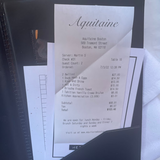 Aquitaine – Boston, MA – 8/1/2016 This is my fourth Aquitaine group restaurant location visit. Each locations décor is a bit different however one common thread shared by all is exceptional customer service and Attention To Detail… At this point I have a certain level of expectation and these people exceeded it. The Boston location just underwent a major renovation. As you walk up to the front of the restaurant you see a beautiful building. The glass front showcases the spectacular interior… A large bar on the left side with lots of shimmering glass and beautifully set white linen table service runs front to back… I was greeted at the front by manager; Anthony who showed me to my table. My server tonight was Jon, a 16 Year veteran with the group… Jon was extremely personable and made some recommendations... Soon after seating Jon brought out the fresh from the oven warm cheese puffs… I could eat a case of these they were so good! Next out a mini warm loaf of bread… although everyone in the Boston metro area seems to get their bread from Iggy’s, theirs tends to have a uniquely Aquitaine shape… Ill give up other carbs during the week to make up for what I had here this evening. Its that good! The Chef sent out an Amuse Bouche for me… Seared Scallop… Cauliflower Puree… Maitake mushroom… to name but just a few of the wonderful ingredients. The flavour was matched by the plating… Spectacular! Based on high recommendations I had the She-Crabe Bisque… it was like a creamy broth loaded with the primest of prime chunks of Crab meat… Just the right amount of everything… Cream Sherry, Saffron, “Old Bay” & local Jonah Crabe… The main this evening… The Duck A L’Orange over a Cauliflower Mousseline, Swiss Chard and Sauce Big… Perfectly prepared and nicely plated… So much so I almost felt guilty taking it apart… Fork by fork…Its one thing to prepare delicious tasting food but when the chef combines flavour with artful food sculpting, now theres talent! Although I wasnt planning on having dessert, Jon’s passionate portrayal of the Crispy Chocolate Bread Pudding made it impossible to say no. The only way I can describe it is to relate it to the diner scene in “when Harry met Sally”… OMG! You need to watch it on YouTube to understand if youre not old enough to remember the movie! And as with all my dinners, I finish with my signature Cappuccino… This, like everything else was yet another perfectly executed endeavor. Aquitaine… Impeccable service… scrumptious cuisine, visually and flavorfully choreographed into something really special... These are two of the reasons I love coming here. Ive just added it to my “must go back to” list! You will love it!